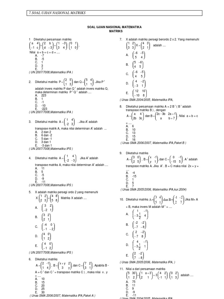 Pada kesempatan kali ini admin akan membagikan latihan soal ksm matematika mts dan kunci jawaban terbaru 2019. Dari beberapa soal yang pernah keluar dalam ujian nasional matematika model soal matriks yang paling sering muncul adalah menentukan invers dari suatu matriks menentukan perkalian matriks menentukan determinan dari hasil kali invers matriks menentukan transpose matriks dan menentukan nilai koefisien berdasarkan konsep kesamaan matriks. Di kesempatan kali ini admin akan memberikan latihan soal usbn matematika wajib sma dan kunci jawaban terbaru 2019.
