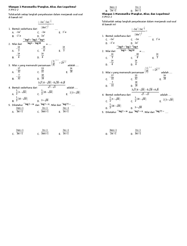 Latihan Bilangan Berpangkat Dan Bentuk Akar Matematika