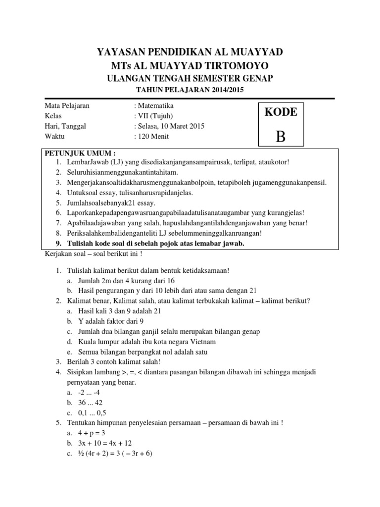 Kumpulan Soal Matematika Smp Kelas 7 Semester 1 Didno76 Com