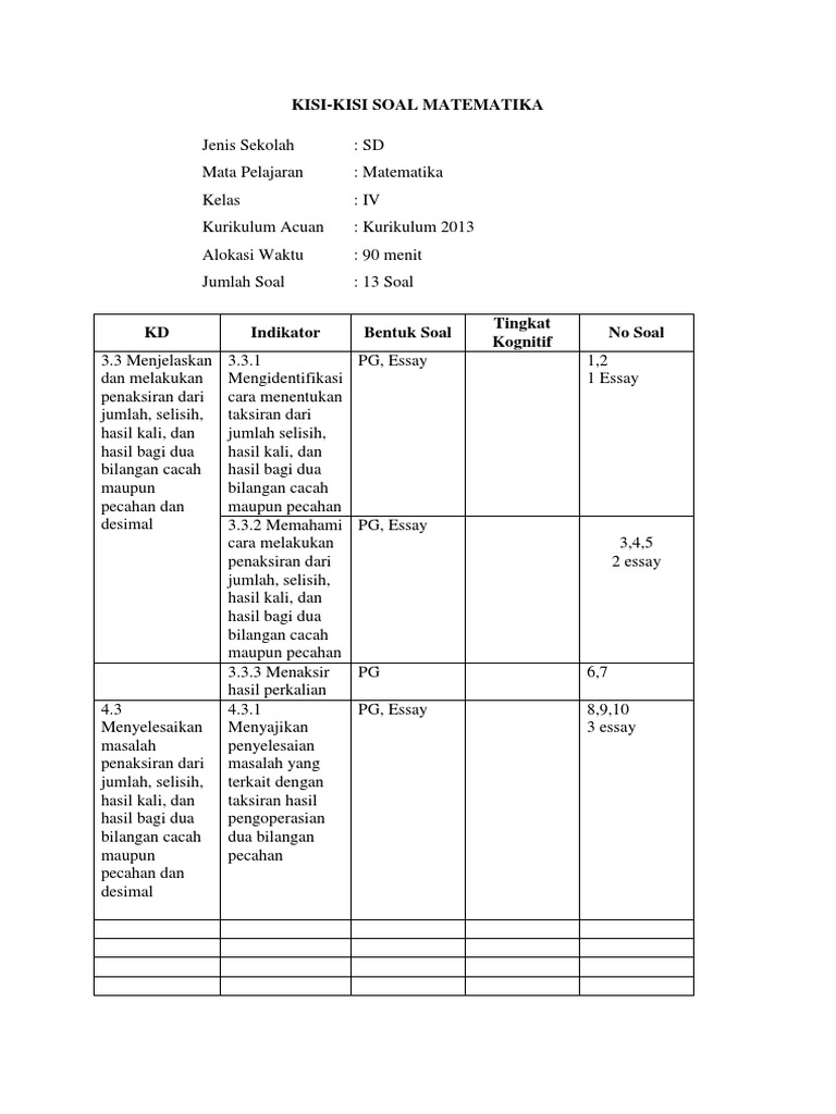 Contoh Kisi Kisi Soal Uraian Essay Matematika Usbn Sd Beserta Soal