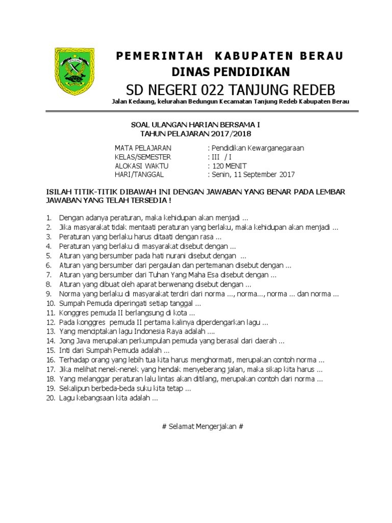 Setiap paket soal terdiri dari jumlah soal yang berbeda beda bergantung pada kedalaman materi pembelajaran. Yang bisa digunakan untuk melengkapi administarsi guru yang dapat di unduh secara gratis dengan menekan tombol download. Laporkan kepada guru pengawas bila terdapat soal yang kurang jelas rusakatau tidak lengkap.