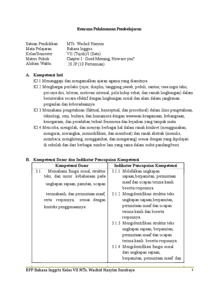 Contoh Rpp K13 Bahasa Inggris Smp Kelas Vii Chapter 1 Good Morning