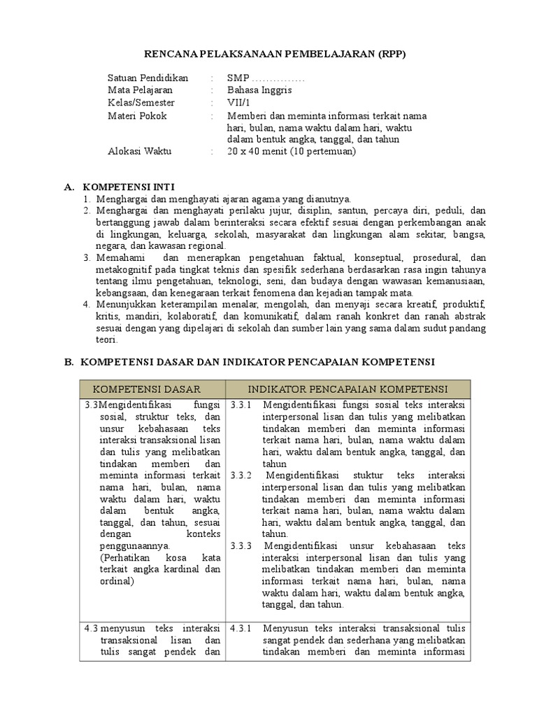 01 Rpp Lesson Plan Smp Kelas Vii Kd 3 7 Dan 4 7