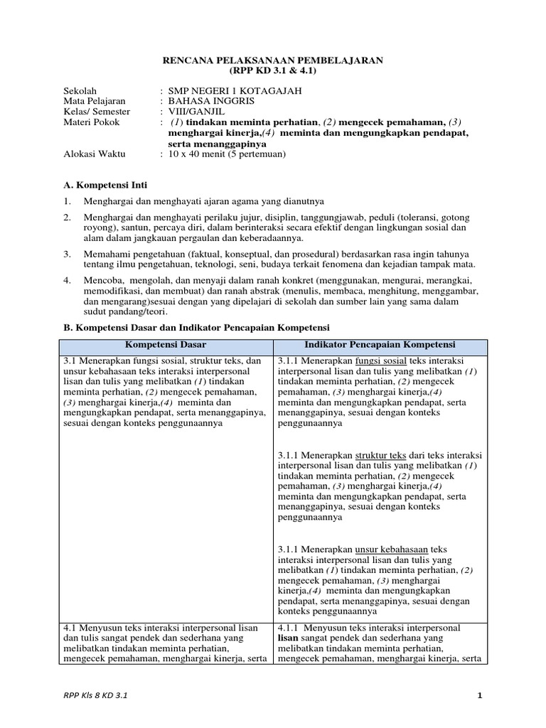 Rpp Kelas 8 Kd 3 1 Dan 4 1 Bahasa Inggris