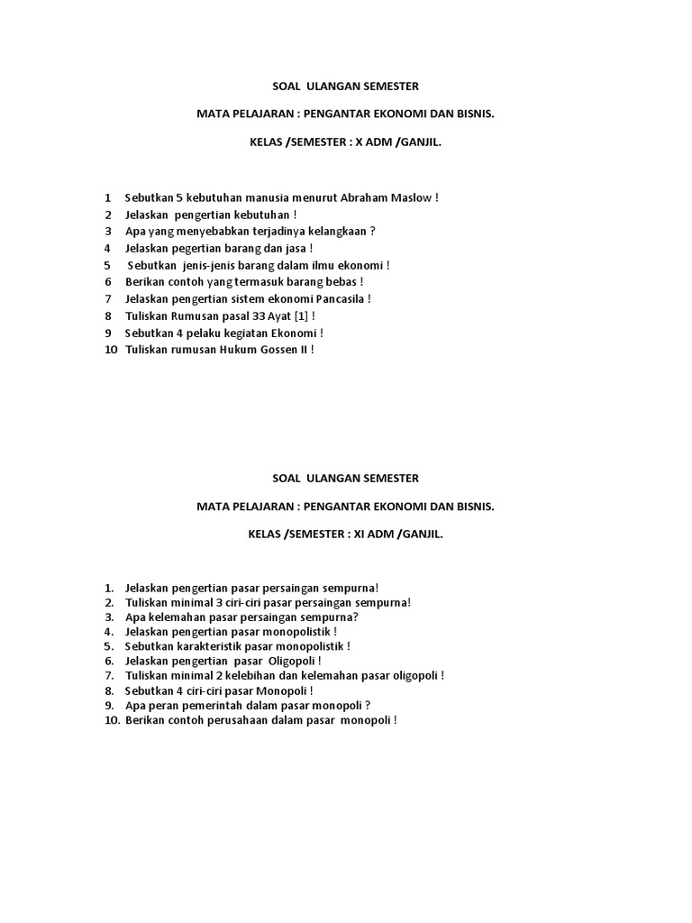 Soal Ulangan Ujian Uas Ekonomi Kelas 10 X Sma Semester 1 Kumpulan