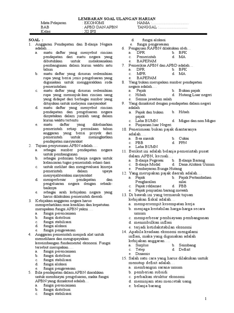 Soal Ulangan Harian Ekonomi Kelas Xi Ips Semester Ganjil 2017 2018
