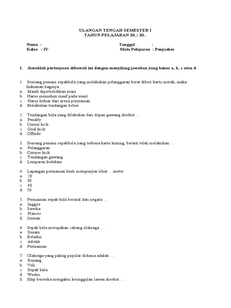 Soal Ujian Ulangan Uas Pjok Penjaskes Kelas 4 Sd Semester 1
