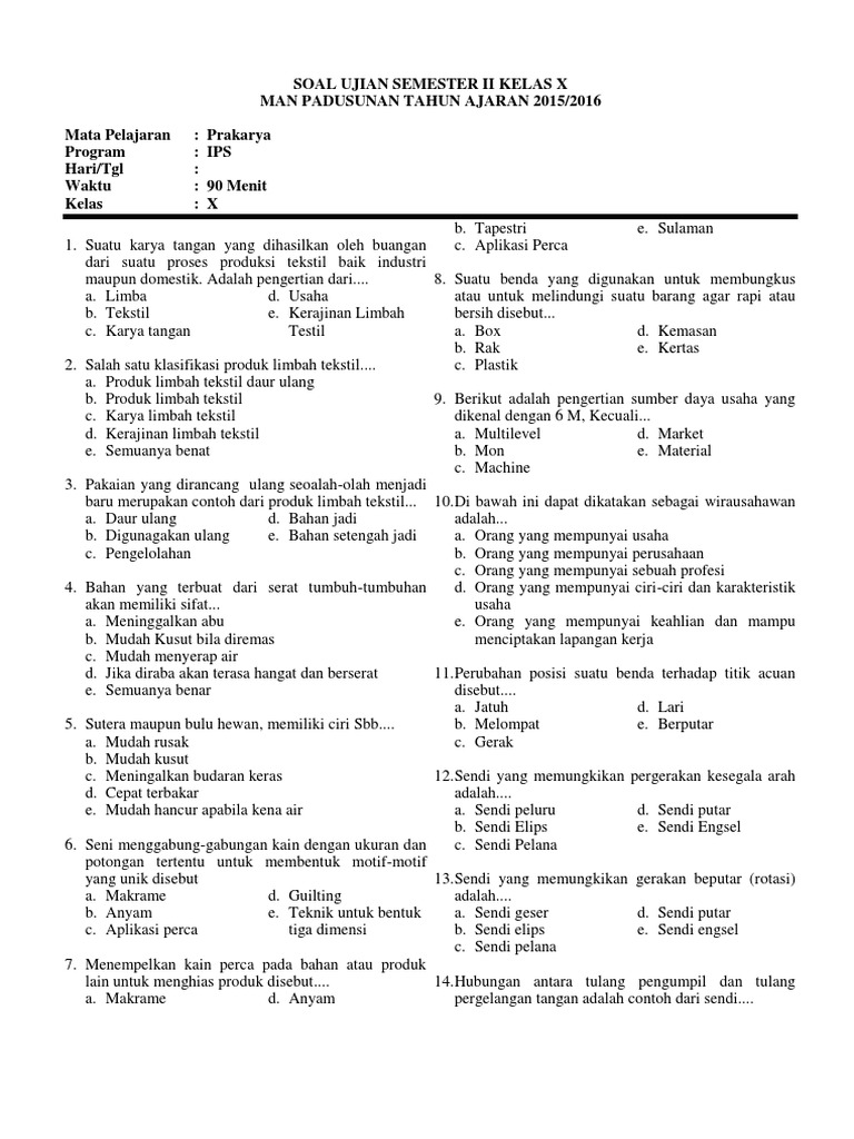 Soal Ujian Prakarya Kelas X Semester Ii 2015 2016
